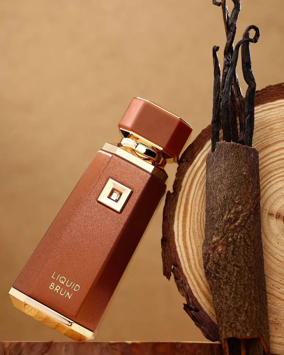 The base notes of Liquid Brun are where its true depth and complexity shine. The combination of praline, musk, ambroxan, and guaiac wood delivers a lasting impression that is both robust and refined. This intricate blend ensures that the scent evolves beautifully over time, leaving a memorable trail wherever you go.